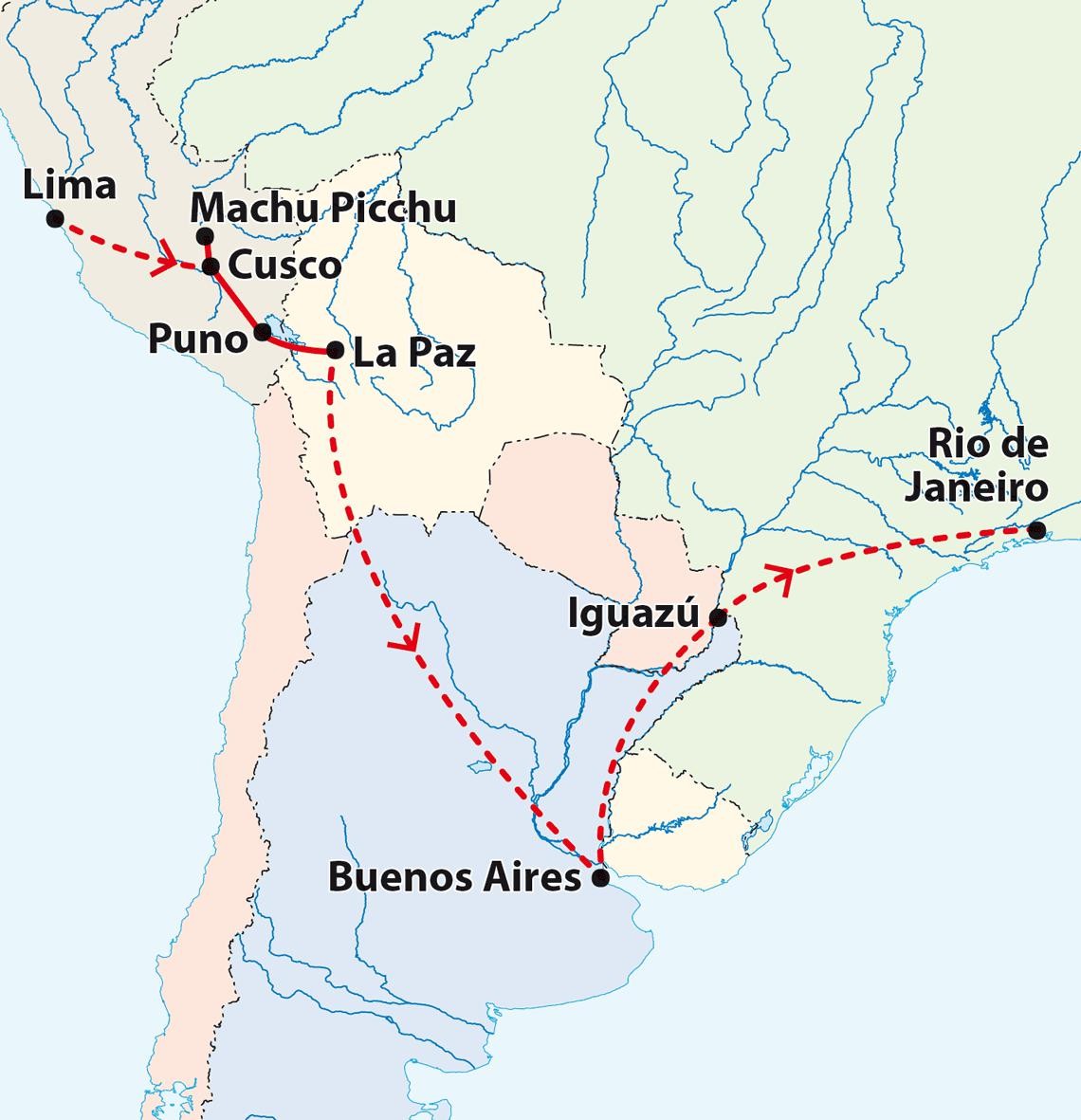 Von den geheimnisvollen Anden über den legendären Titicacasee bis zu den rhythmischen Stränden Rios führt diese Rundreise durch Peru, Bolivien, Argentinien und Brasilien. Faszinierende Kulturen, spektakuläre Landschaften und pulsierende Städte machen sie zu einem unvergesslichen Erlebnis.